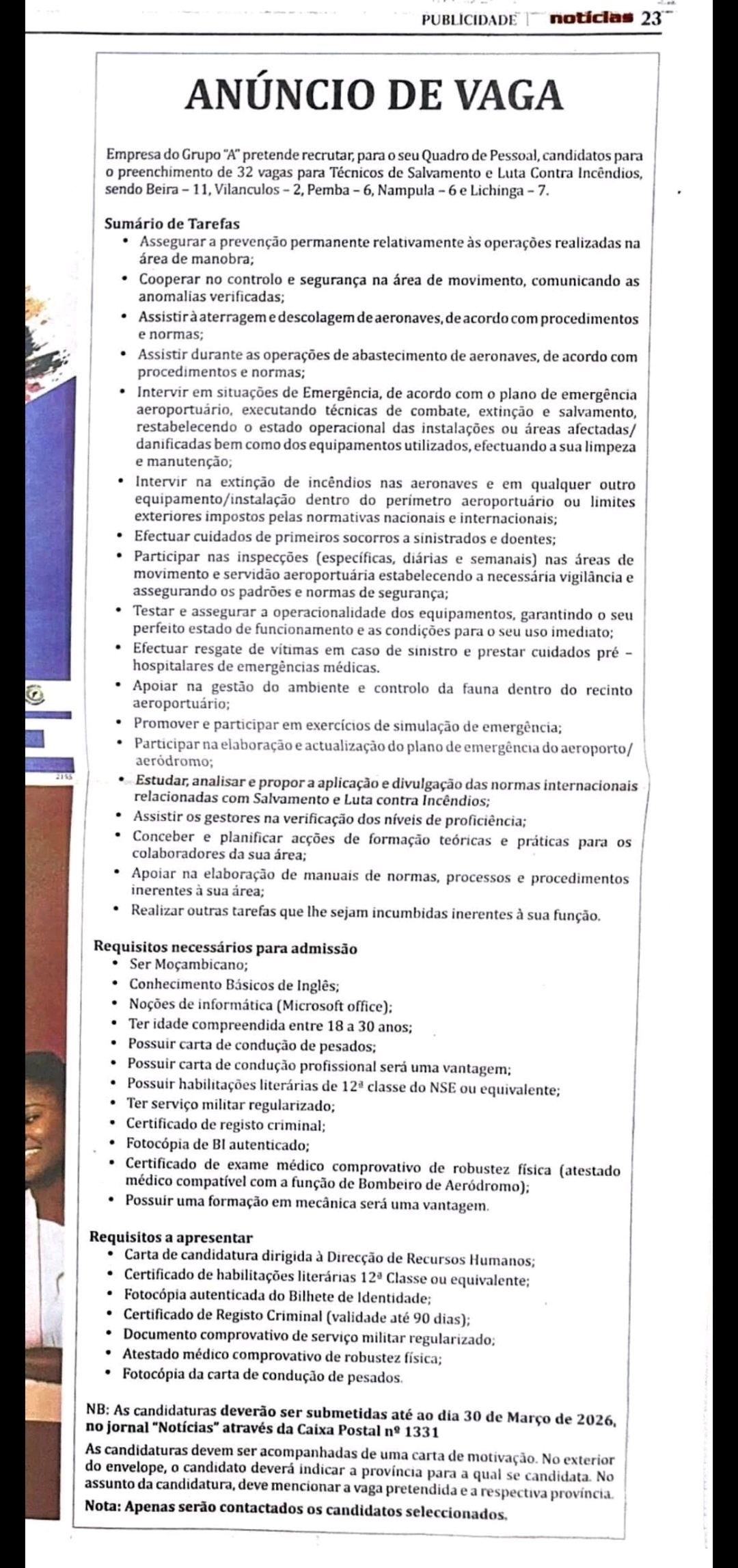 Empresa do Grupo “A” pretende recrutar, para o seu Quadro de Pessoal, candidatos para o preenchimento de 32 vagas para *Técnicos de Salvamento e Luta Contra Incêndios*, sendo: