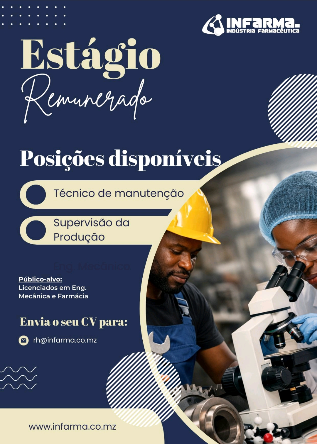 A Infarma – Indústria Farmacêutica pretende recrutar 02 (dois) estagiários, um para a área de engenharia e manutenção, outro para a área de Produção.