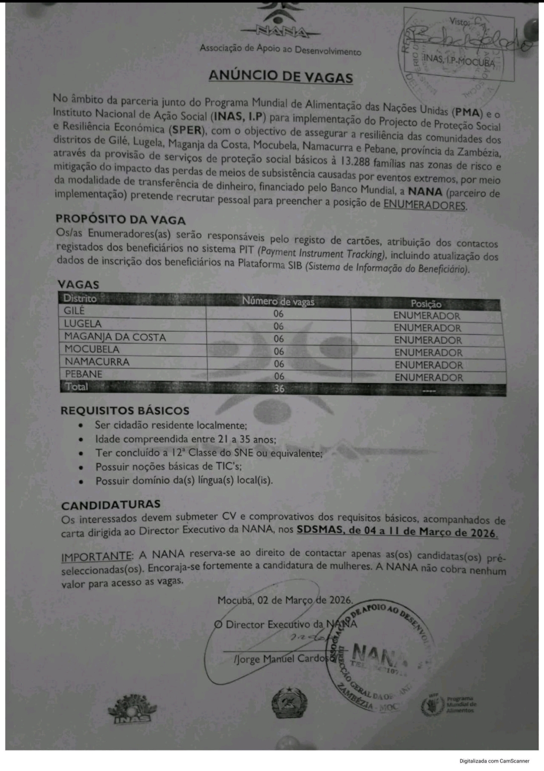 No âmbito da parceria junto do Programa Mundial de Alimentação das Nações Unidas (PMA) e o Instituto Nacional de Ação Social (INAS, I.P) para implementação do Projeto de Proteção Social e Resiliência Económica (SPER), com o objetivo de garantir a resiliência das comunidades dos distritos de Gilé, Lugela, Maganja da Costa, Mocubela, Namacurra e Pebane, província da Zambézia, através da prestação de serviços de proteção social básicos à 13.288 famílias nas zonas de risco e mitigação do impacto das perdas de meios de subsistência causadas por eventos extremos, por meio da modalidade de transferência de dinheiro, financiadas pelo Banco Mundial, a NANA (parceiro de implementação) pretendem recrutar pessoal para preencher a posição de ENUMERADORES.