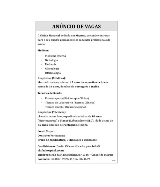 O Shifaa Hospital, sediado em Maputo, pretende contratar para o seu quadro permanente os seguintes profissionais de saúde: