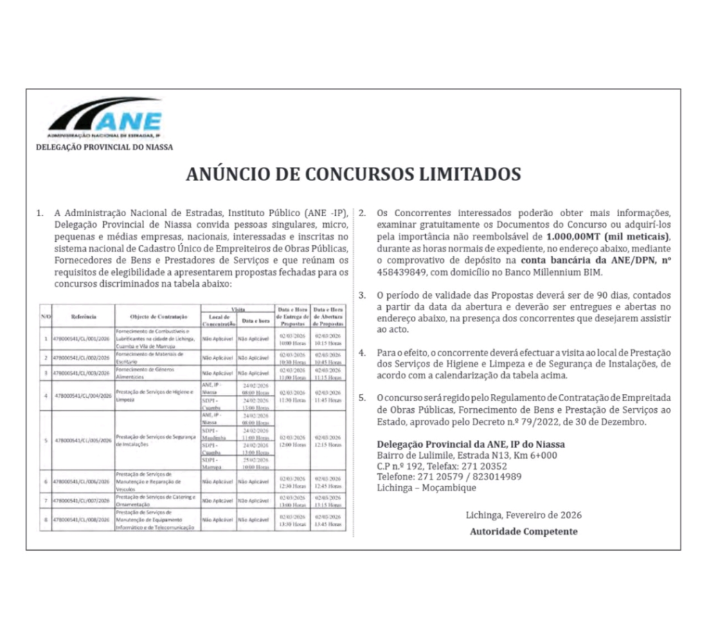 A Administração Nacional de Estradas, Instituto Público (ANE -IP), Delegação Provincial de Niassa convida pessoas singulares, micro, pequenas e médias empresas, nacionais, interessadas e inscritas no sistema nacional de Cadastro Único de Empreiteiros de Obras Públicas, Fornecedores de Bens e Prestadores de Serviços e que reúnam os requisitos de elegibilidade a apresentarem propostas fechadas para os concursos discriminados na tabela abaixo.