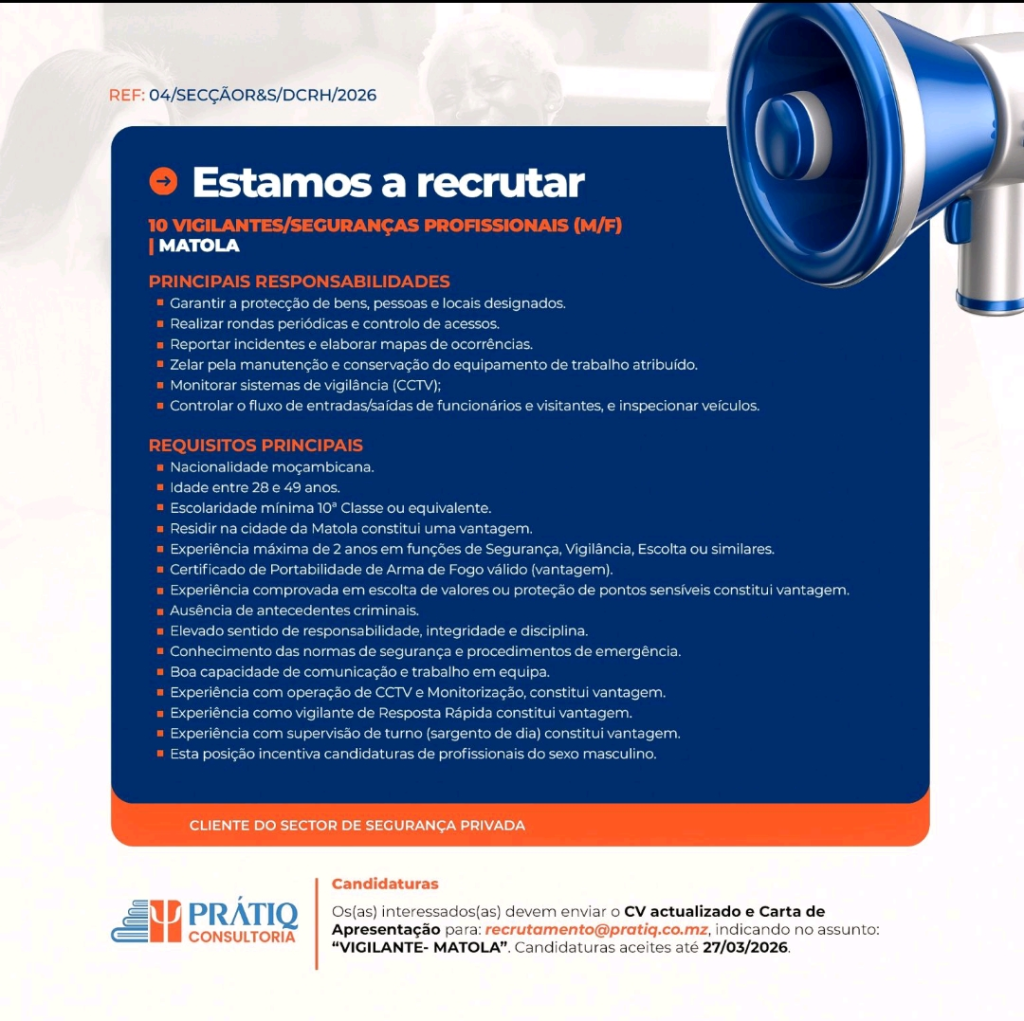 Read MoreEstamos a recrutar! Procuramos 10 Vigilantes/Seguranças Profissionais (M/F) para a cidade da Matola, para integrar um cliente de referência no