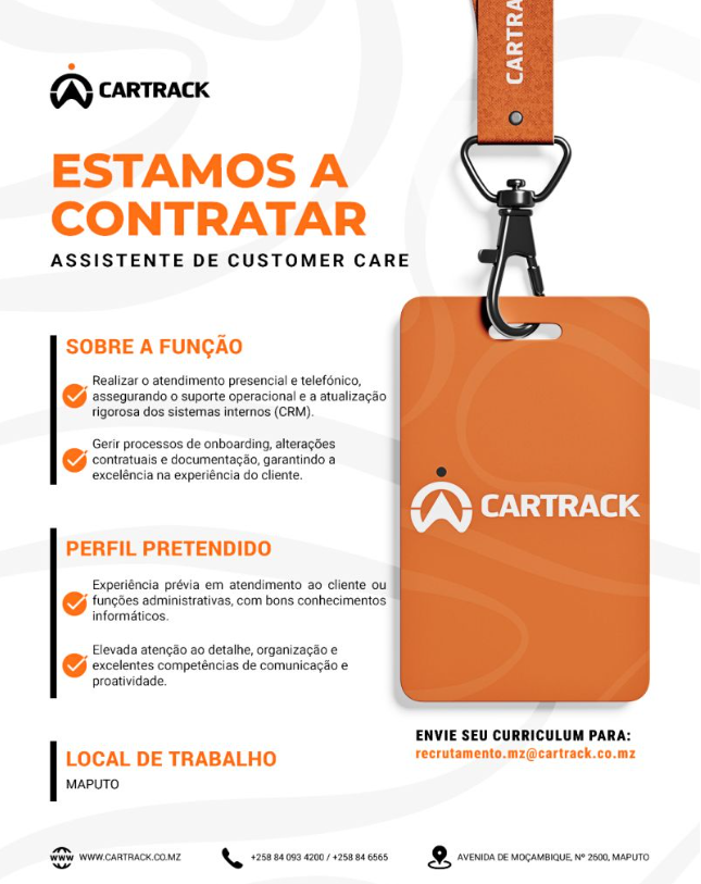 A Cartrack Moçambique está a crescer e procuramos um(a) 𝗔𝘀𝘀𝗶𝘀𝘁𝗲𝗻𝘁𝗲 𝗱𝗲 𝗖𝘂𝘀𝘁𝗼𝗺𝗲𝗿 𝗖𝗮𝗿𝗲 para se juntar à nossa equipa de Operações em Maputo.