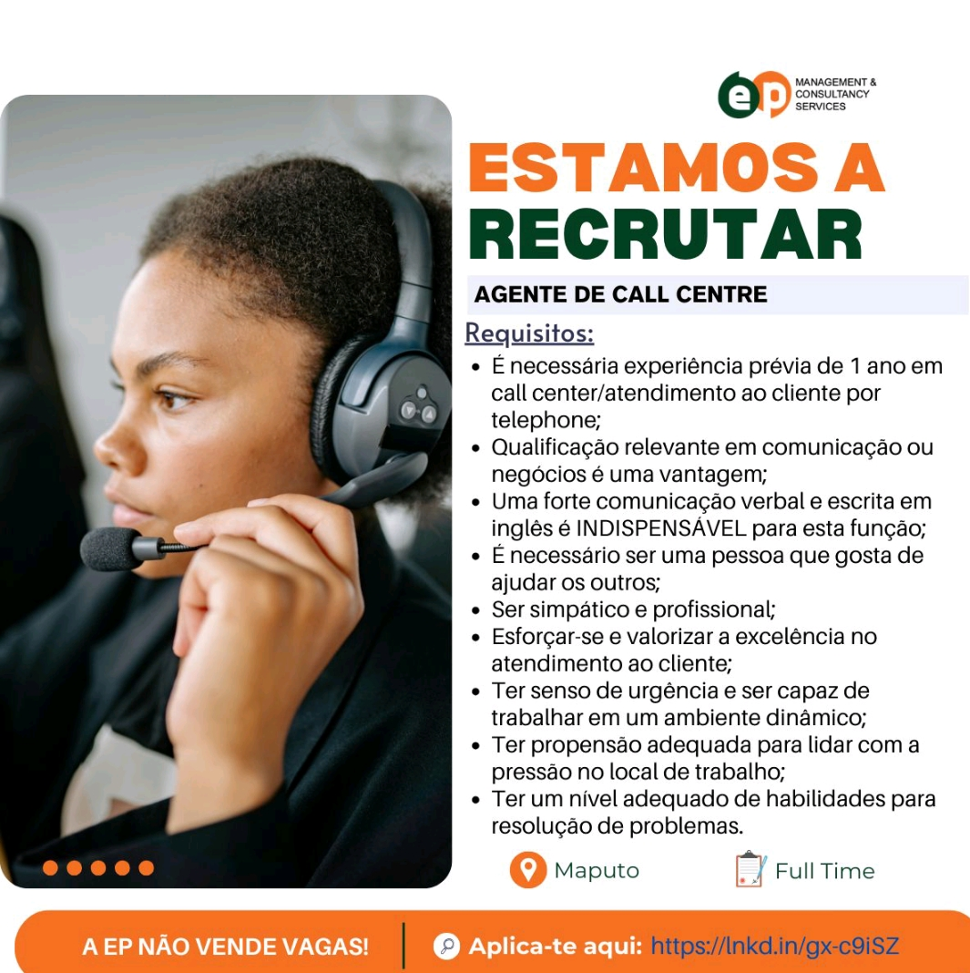 A EP Management & Consultancy Services, esta a recrutar um(a) AGENTE DE CALL CENTRE para Maputo.