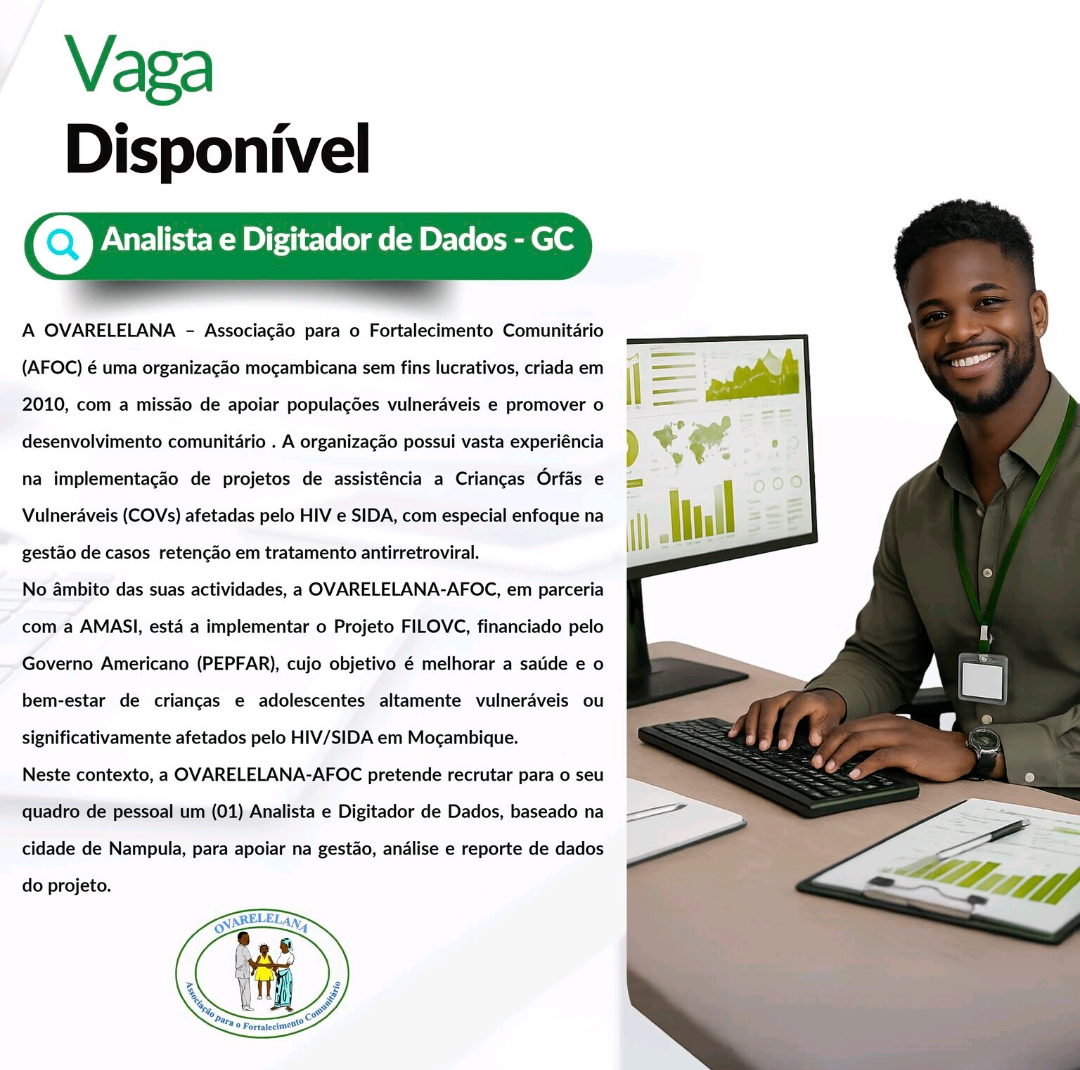 A OVARELELANA – Associação para o Fortalecimento Comunitário (AFOC) pretende recrutar 1 Analista e Digitador de Dados para a Cidade de Nampula, no âmbito do Projecto FILOVC, implementação em parceria com a AMASI e financiado pelo Governo Americano (PEPFAR).
