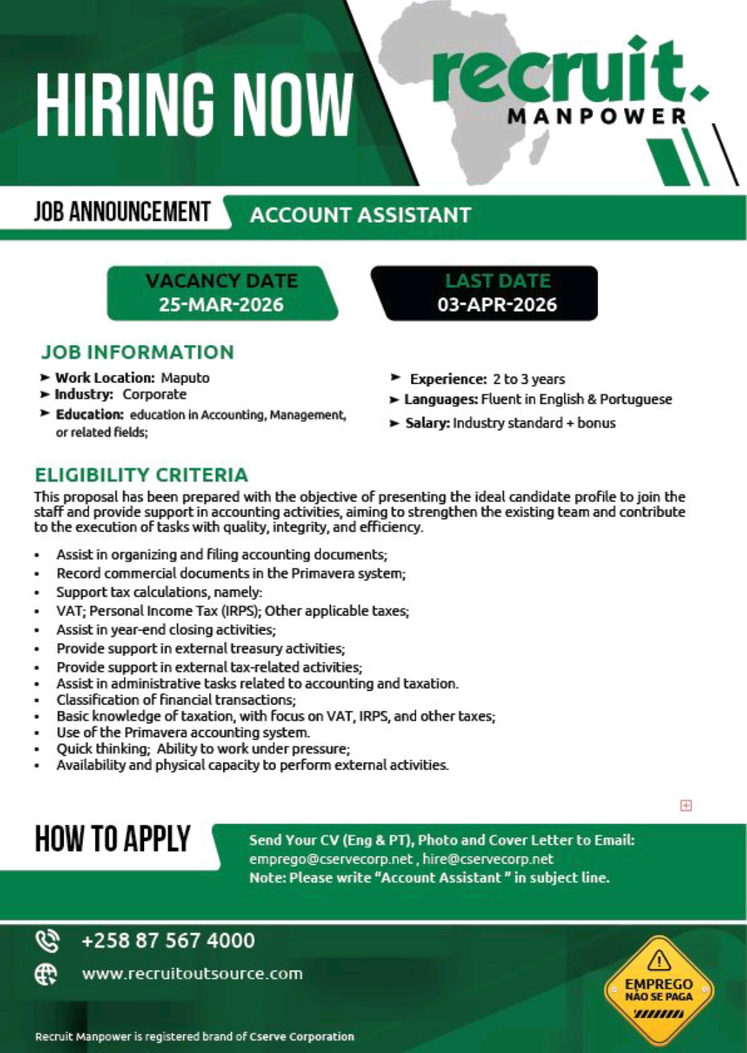 A CSERVE CORP está a recrutar um Assistente de Contabilidade em Moçambique. Além disso, esta vaga oferece a oportunidade de ganhar experiência prática em contabilidade e finanças, contribuindo para o crescimento profissional e organizacional.