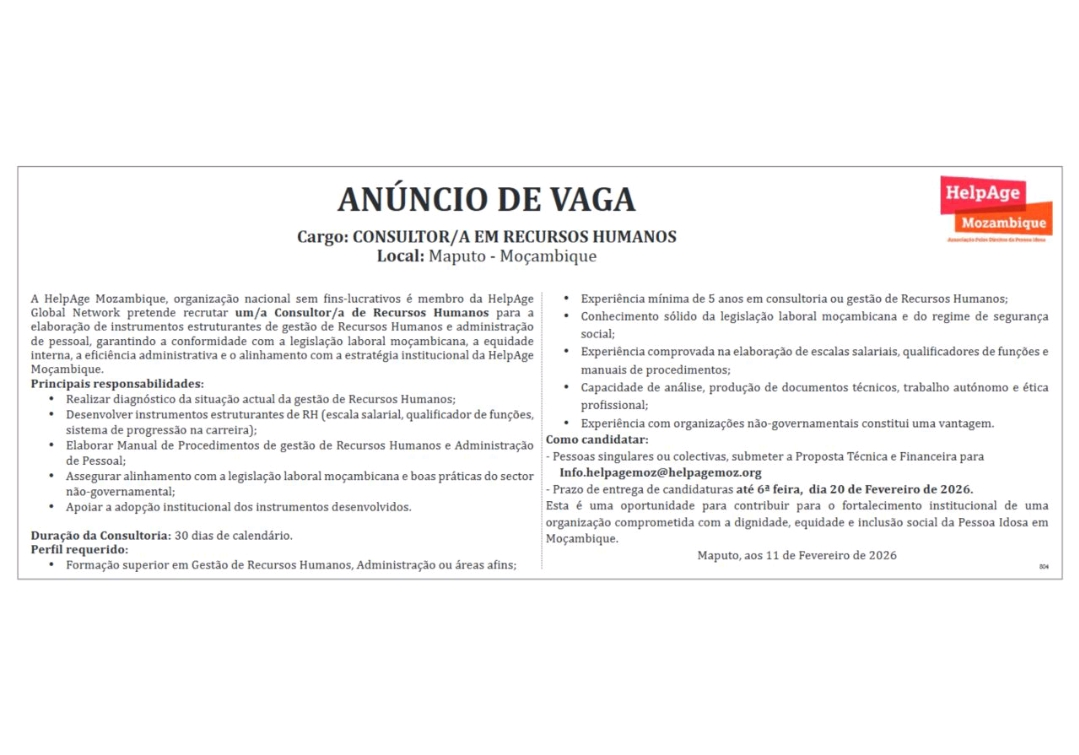 A HelpAge Moçambique, organização nacional sem fins lucrativos, é membro da HelpAge Global Network, pretende recrutar um/a Consultor(a) de Recursos Humanos para a elaboração de instrumentos estruturantes de gestão de Recursos Humanos e administração de pessoal, garantindo a conformidade com a legislação trabalhista moçambicana, a equidade interna, a eficiência administrativa e o alinhamento com a estratégia institucional da HelpAge Moçambique.