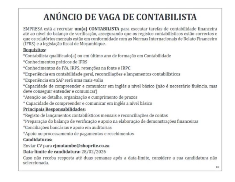 EMPRESA está a recrutar um(a) CONTABILISTA para executar tarefas de contabilidade financeira até ao nível do balanço de verificação, assegurando que os registos contabilísticos estão correctos e que os relatórios mensais estão em conformidade com as Normas Internacionais de Relato Financeiro (IFRS) e a legislação fiscal de Moçambique.