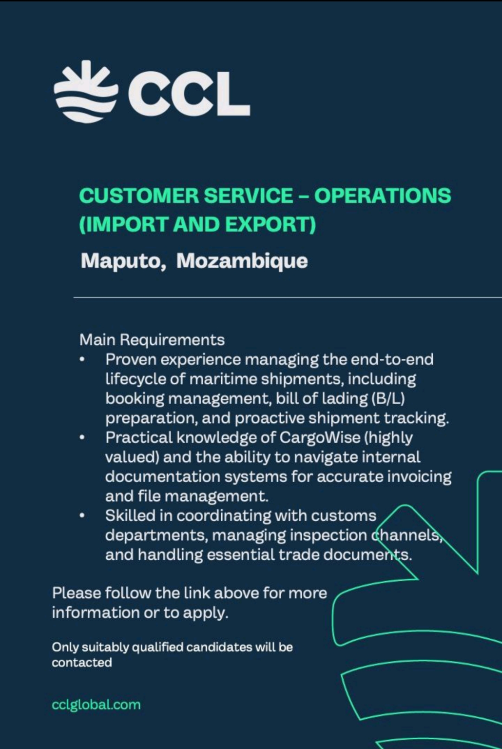 We are currently managing the recruitment for a prominent international freight forwarder’s team in Maputo. We are looking for an Operations Specialist with a minimum of 1 year of experience in maritime traffic and a strong command of CargoWise to ensure seamless import and export services for their global clientele.
