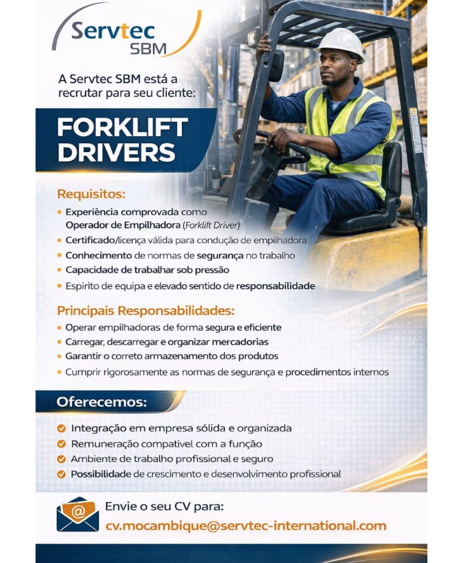 A Servtec SBM está a recrutar para seu cliente MOTORISTAS DE EMPILHADEIRA MAPUTO