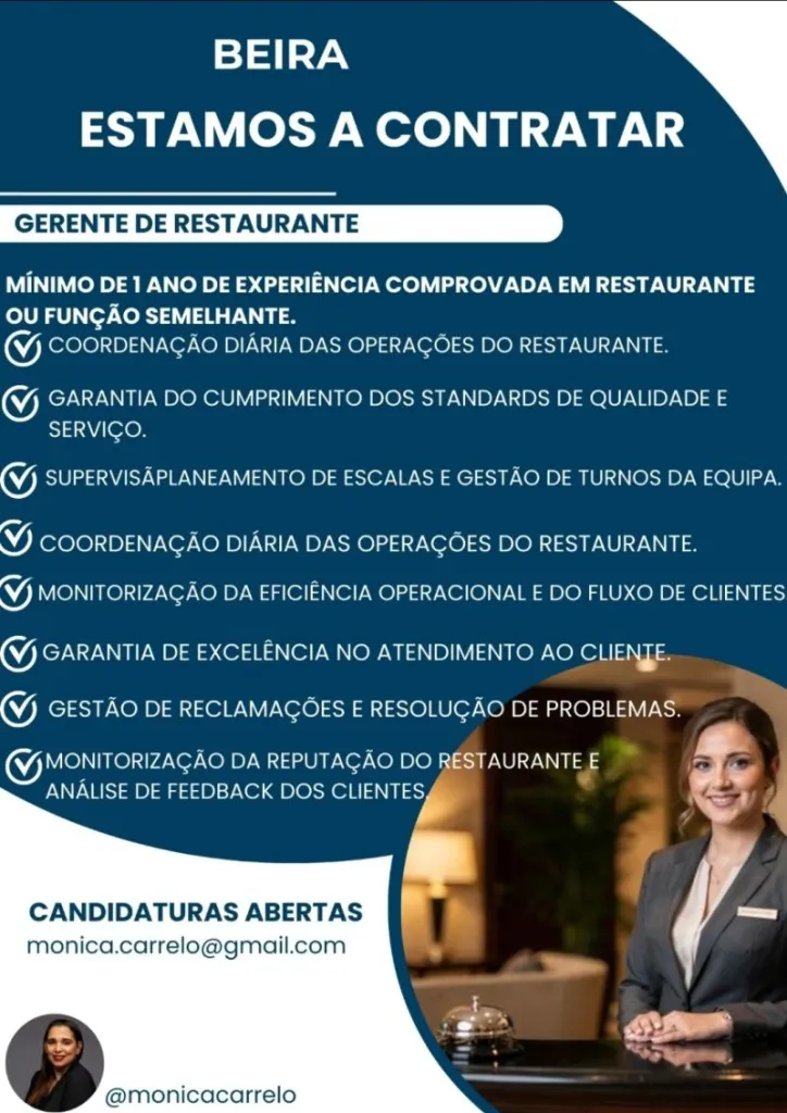 Procuramos um profissional com experiência em gestão de restaurante, liderança de equipa e foco na excelência no atendimento.