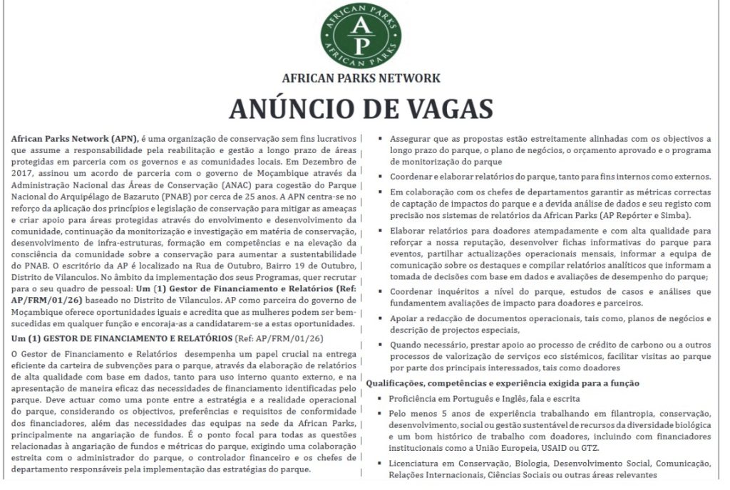 African Parks Network (APN), é uma organização de conservação sem fins lucrativos que assume a responsabilidade pela reabilitação e gestão a longo prazo de áreas protegidas em parceria com os governos e as comunidades locais. Em Dezembro de 2017, assinou um acordo de parceria com o governo de Moçambique através da Administração Nacional das Áreas de Conservação (ANAC) para cogestão do Parque Nacional do Arquipélago de Bazaruto (PNAB) por cerca de 25 anos. A APN centra-se no reforço da aplicação dos princípios e legislação de conservação para mitigar as ameaças e criar apoio para áreas protegidas através do envolvimento e desenvolvimento da comunidade, continuação da monitorização e investigação em matéria de conservação, desenvolvimento de infra-estruturas, formação em competências e na elevação da consciência da comunidade sobre a conservação para aumentar a sustentabilidade do PNAB. O escritório da AP é localizado na Rua de Outubro, Bairro 19 de Outubro, Distrito de Vilanculos. No âmbito da implementação dos seus Programas, quer recrutar para o seu quadro de pessoal: Um (1) Gestor de Financiamento e Relatórios (Ref: AP/FRM/01/26) baseado no Distrito de Vilanculos. AP como parceira do governo de Moçambique oferece oportunidades iguais e acredita que as mulheres podem ser bem-sucedidas em qualquer função e encoraja-as a candidatarem-se a estas oportunidades.