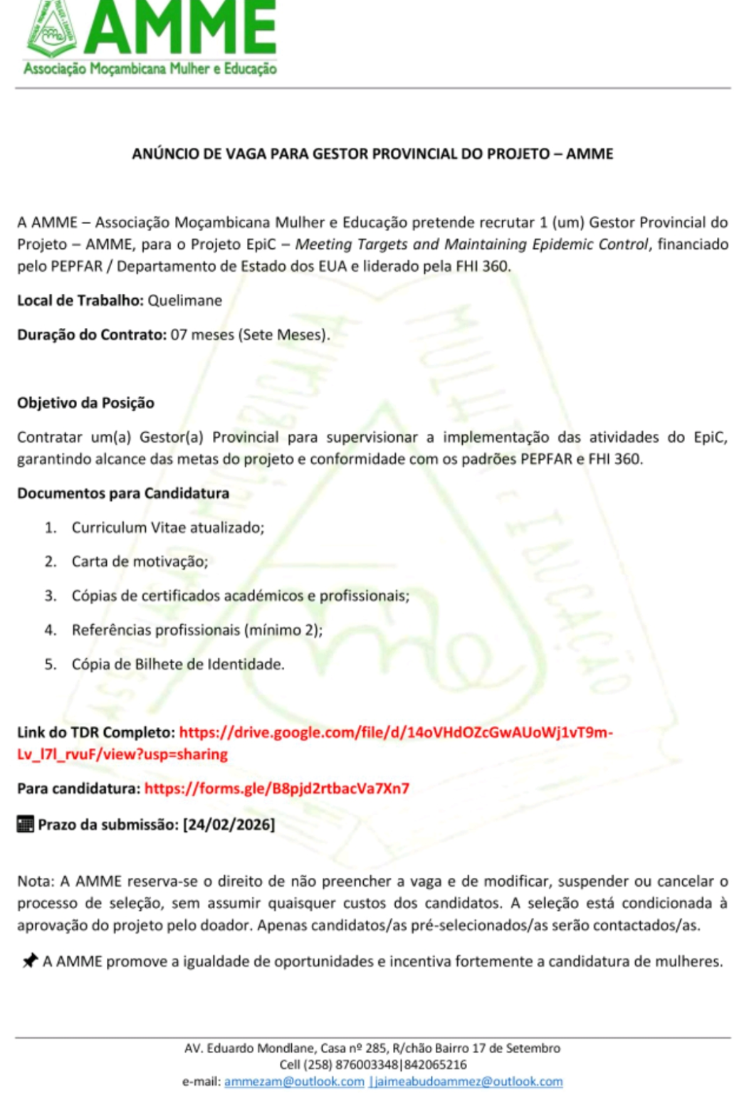 A AMME – Associação Moçambicana Mulher e Educação pretende recrutar 1 (um) Gestor(a) Provincial do Projecto – AMME, para o Projeto EpiC – Meeting Targets and Maintaining Epidemic Control, financiado pelo PEPFAR / Departamento de Estado dos EUA e liderado pela FHI 360.
