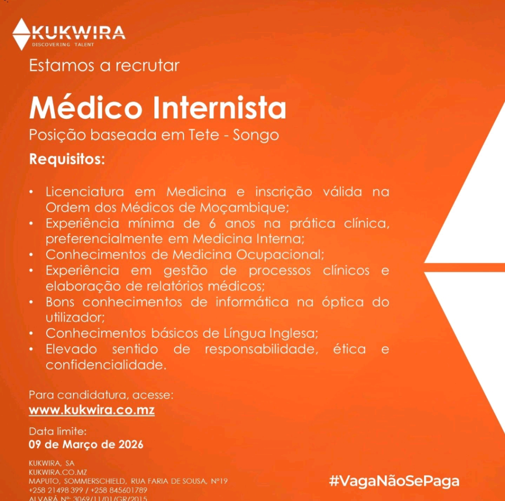 Kukwira Moçambique, está a recrutar um Médico Internista para um cliente na província de Tete – Songo.
