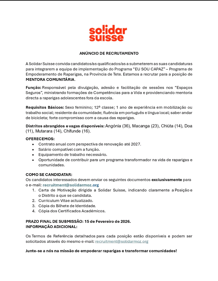 A Solidar Suisse convida candidatos/as variações/as a submeterem as suas candidaturas para integrarem a equipa de implementação do Programa “EU SOU CAPAZ” – Programa de Empoderamento de Raparigas, na Província de Tete. Estamos a recrutar para a posição de MENTORA COMUNITÁRIA.