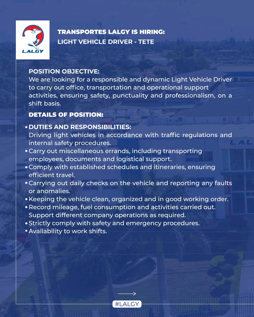 A Transportes Lalgy, está a procura de um(a) MOTORISTA DE VIATURA LIGEIRA, para a delegação de Tete, para se juntar à sua equipa e ajudar a alcançar a visão e missão.