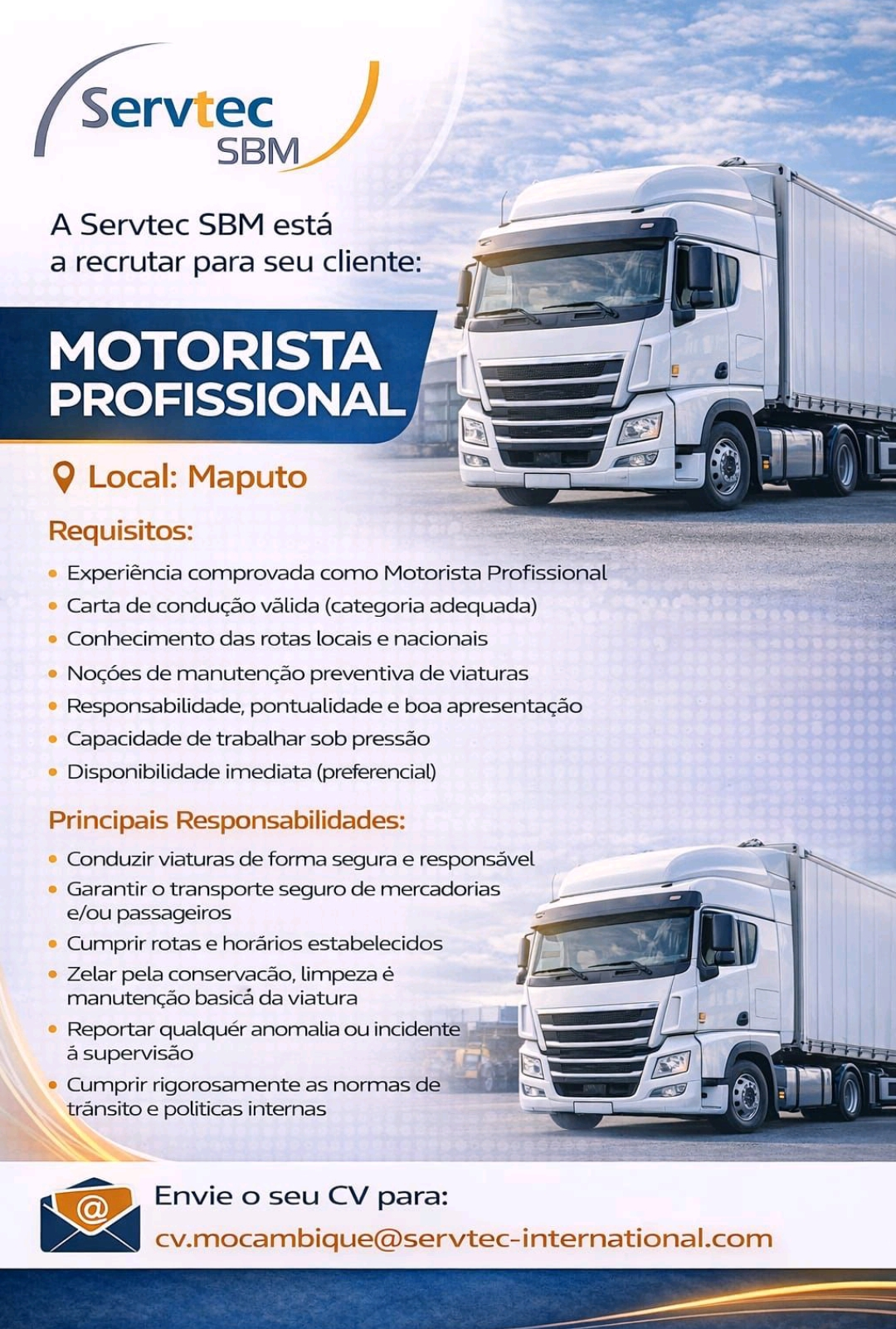 A Servtec SBM está a recrutar para seu cliente |MOTORISTA PROFISSIONAL |Maputo