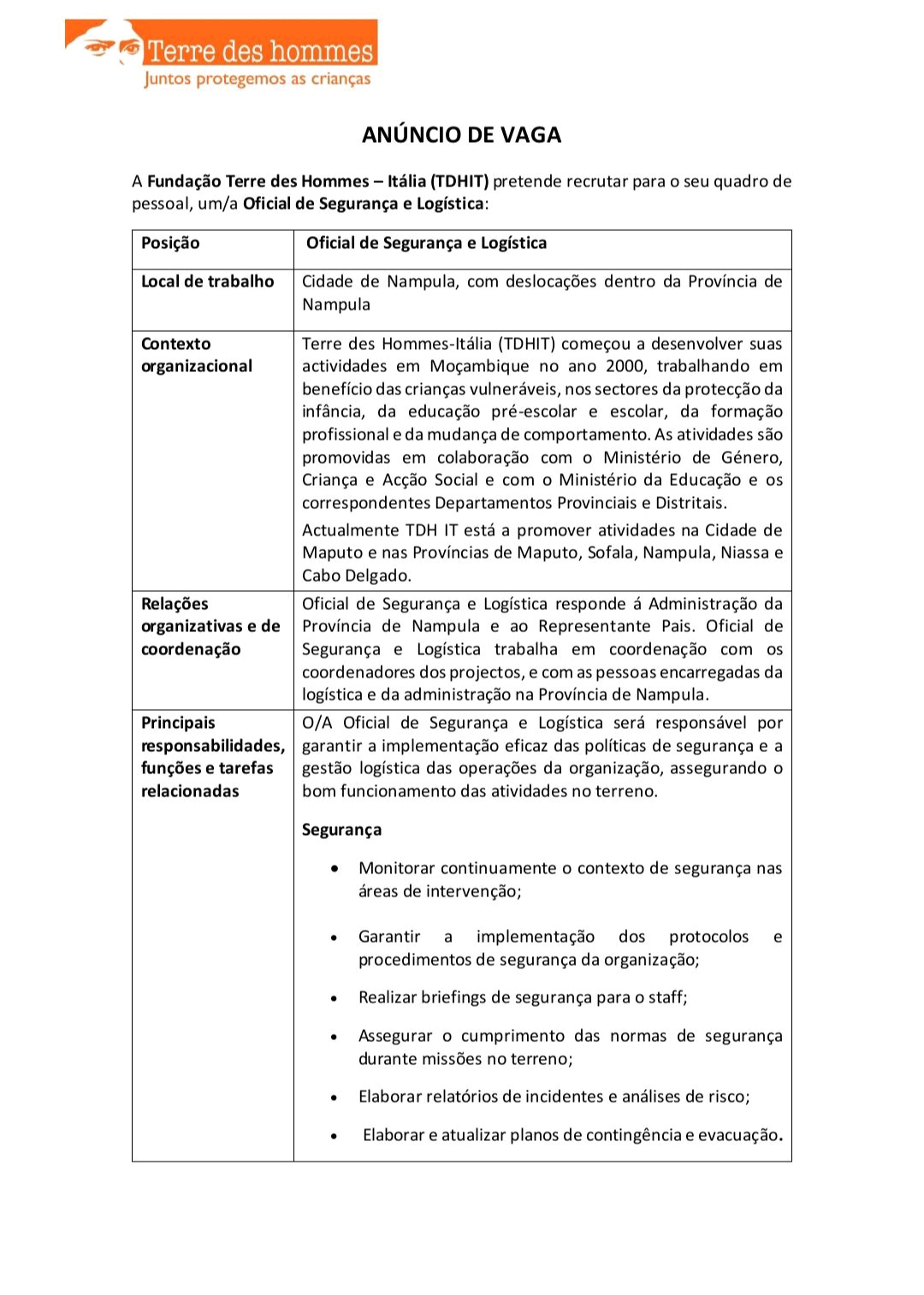 A Fundação Terre des Hommes – Itália (TDHIT) pretende recrutar para o seu quadro de pessoal, um/a Oficial de Segurança e Logística.