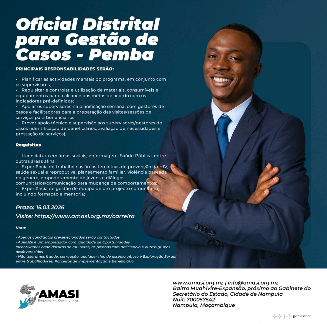 Candidate-se aqui: https://amasi.org.mz/estamos-a-procura-de-oficial-distrital-para-gestao-de-casos-pemba-cabo-delgado/