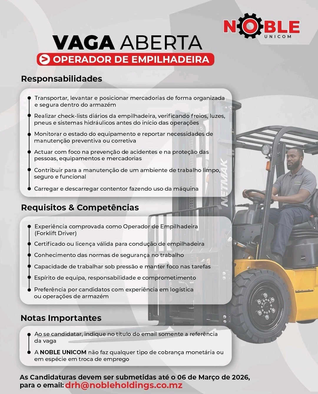 - Certificado ou licença válida para condução de empilhadeira;