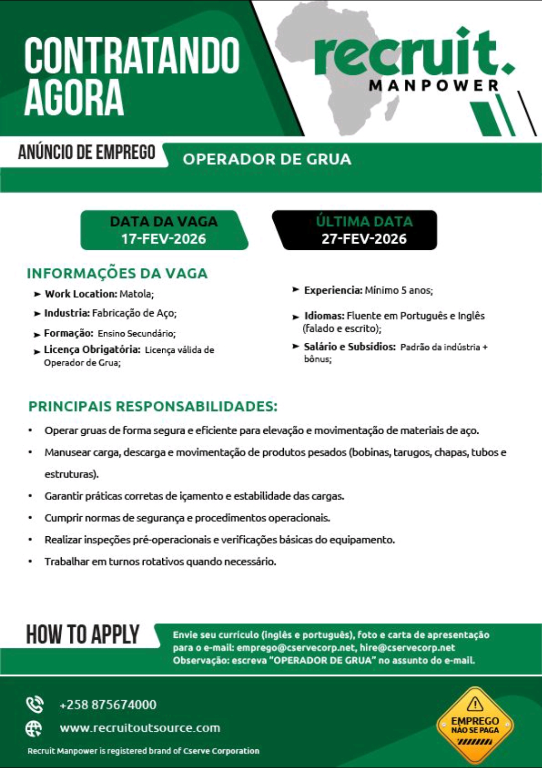 Nota: Por favor, escreva OPERADOR DE GRUA na linha do assunto