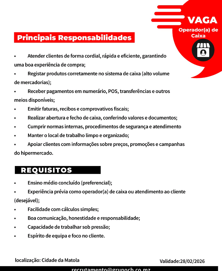 - Experiência prévia como operador(a) de caixa ou atendimento ao cliente (desejável);