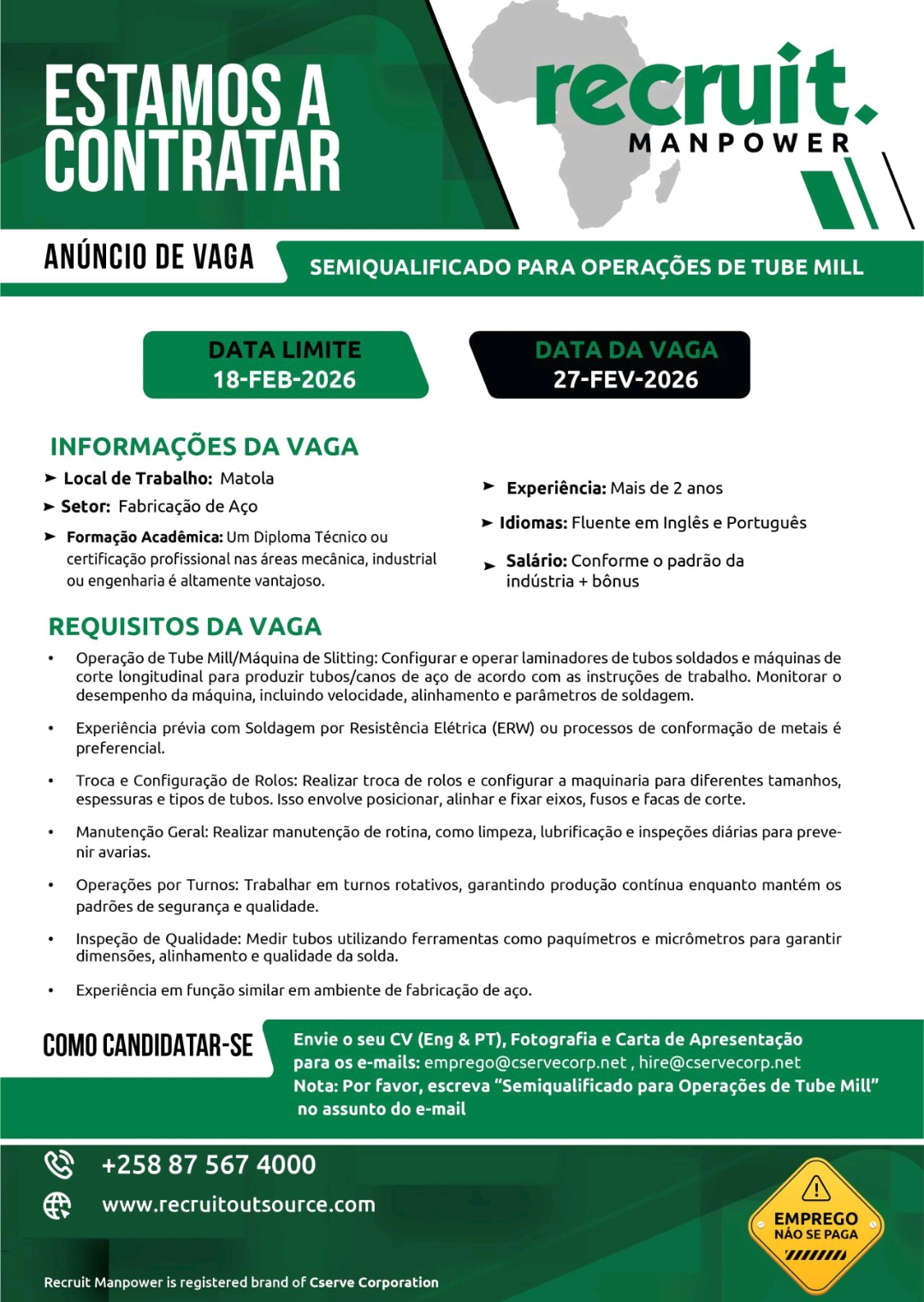 Nota: Por favor, escreva SEMIQUALIFICADO PARA OPERAÇÕES DE TUBE MILL na linha do assunto