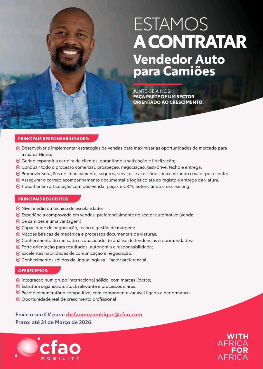 A CFAO Mobility Mozambique está a contratar um Vendedor Auto para Camiões.