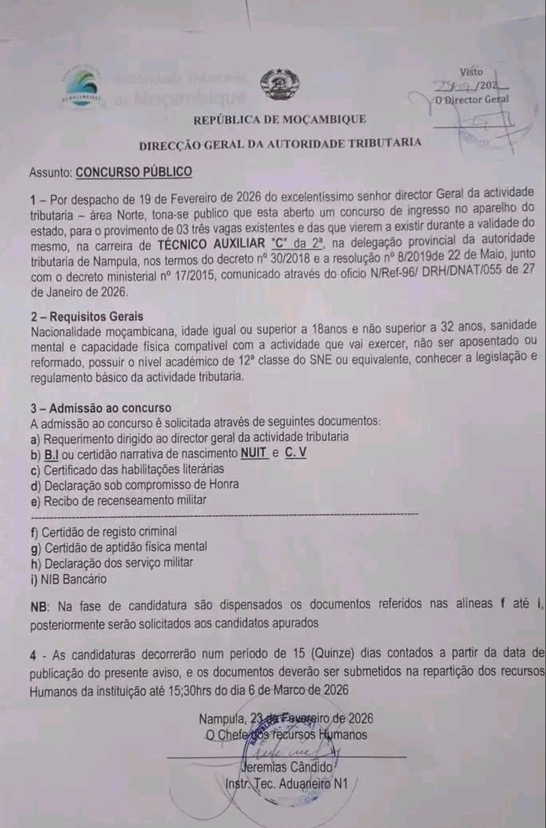 1- Por despacho de 19 de Fevereiro de 2026 do excelentíssimo senhor diretor Geral da atividade tributária – área Norte, tona-se publico que está aberto um concurso de ingresso no aparelho do estado, para o provimento de 03 vagas existentes e das que vierem a existir durante a validade do mesmo, na carreira de TÉCNICO AUXILIAR “C” da 2ª, na delegação provincial da autoridade tributária de Nampula, nos termos do decreto nº 30/2018 e a resolução nº 8/2019de 22 de Maio, juntamente com o decreto ministerial nº 17/2015, comunicado através do oficio N/Ref-96/DRH/DNAT/055 de 27 de Janeiro de 2026.