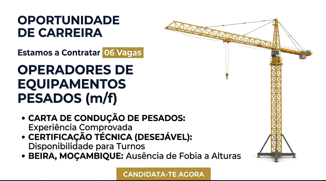 Os interessados devem enviar o seu currículo atualizado para [email protected], com o assunto “Candidatura – Operador de Equipamentos Pesados”.
