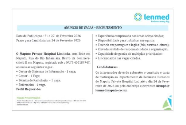 Os interessados deverão submeter o currículo e carta de motivação ao Departamento de Recursos Humanos do Maputo Private Hospital Lad até o dia 24 de Fevereiro de 2026 ou pelo endereço electrónico [email protected].