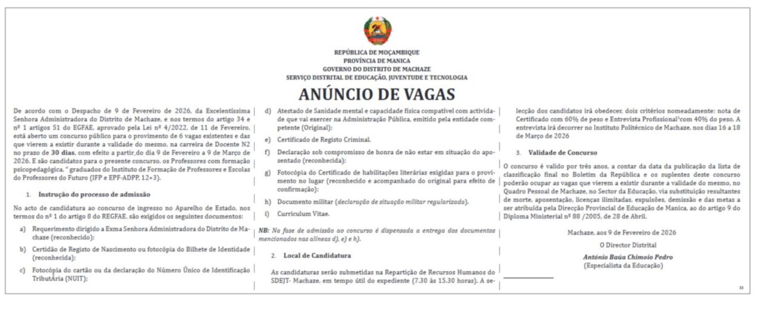 De acordo com o Despacho de 9 de Fevereiro de 2026, da Excelentíssima Senhora Administradora do Distrito de Machaze, e nos termos do artigo 34 e nº 1 artigos 51 do EGFAE, aprovado pela Lei nº 4/2022, de 11 de Fevereiro, está aberto um concurso público para o provimento de 6 vagas existentes e das que vierem a existir durante a validade do mesmo, na carreira de Docente N2 | no prazo de 30 dias, com efeito a partir do dia 9 de Fevereiro a 9 de Março de 2026. E são candidatos para o presente concurso, os Professores com formação psicopedagógica, “graduados do Instituto de Formação de Professores e Escolas do Professores do Futuro (IFP e EPF-ADPP, 12+3).